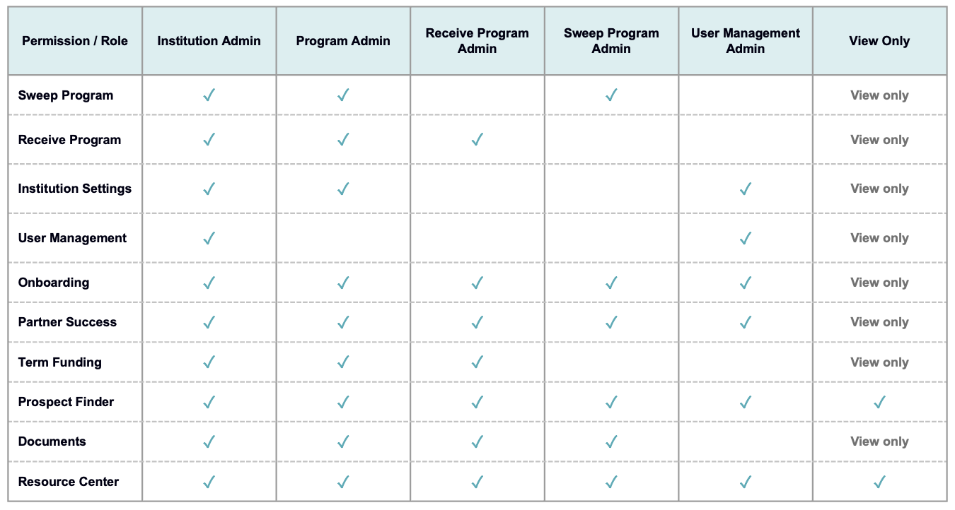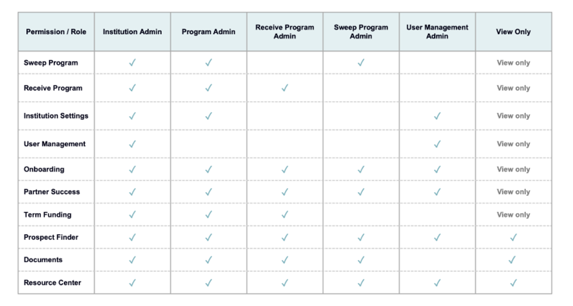 In support of secure and compliant access to the ModernFi Admin Portal, institutions can leverage role-based permissions to control who can access and manage different areas of the platform. This allows you to align portal access with your internal team structure and compliance requirements while ensuring users have access to the functionality relevant to their responsibilities. In summary, User Roles & Permissions help your institution: